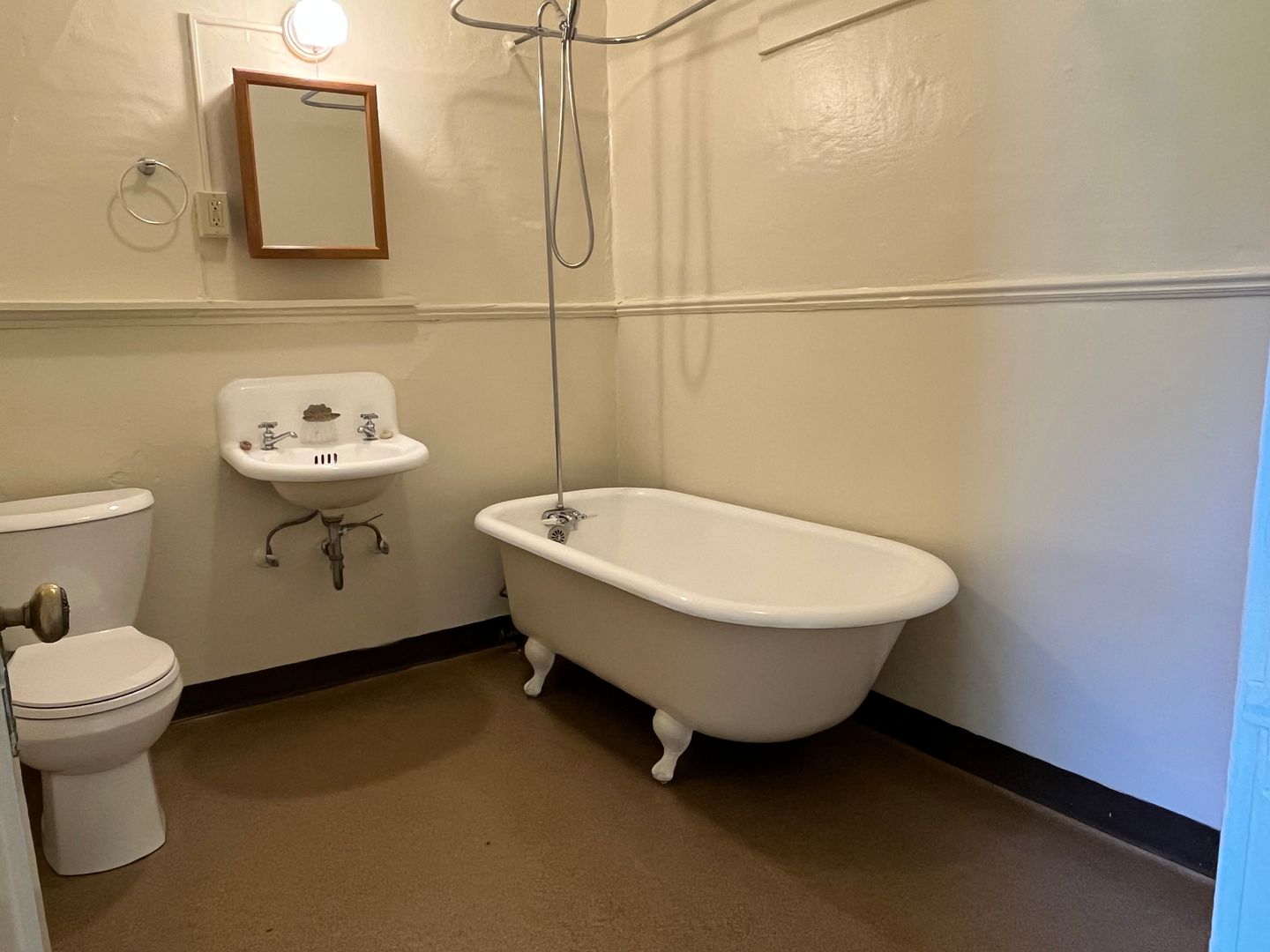 Large vintage bathtub with shower ring.