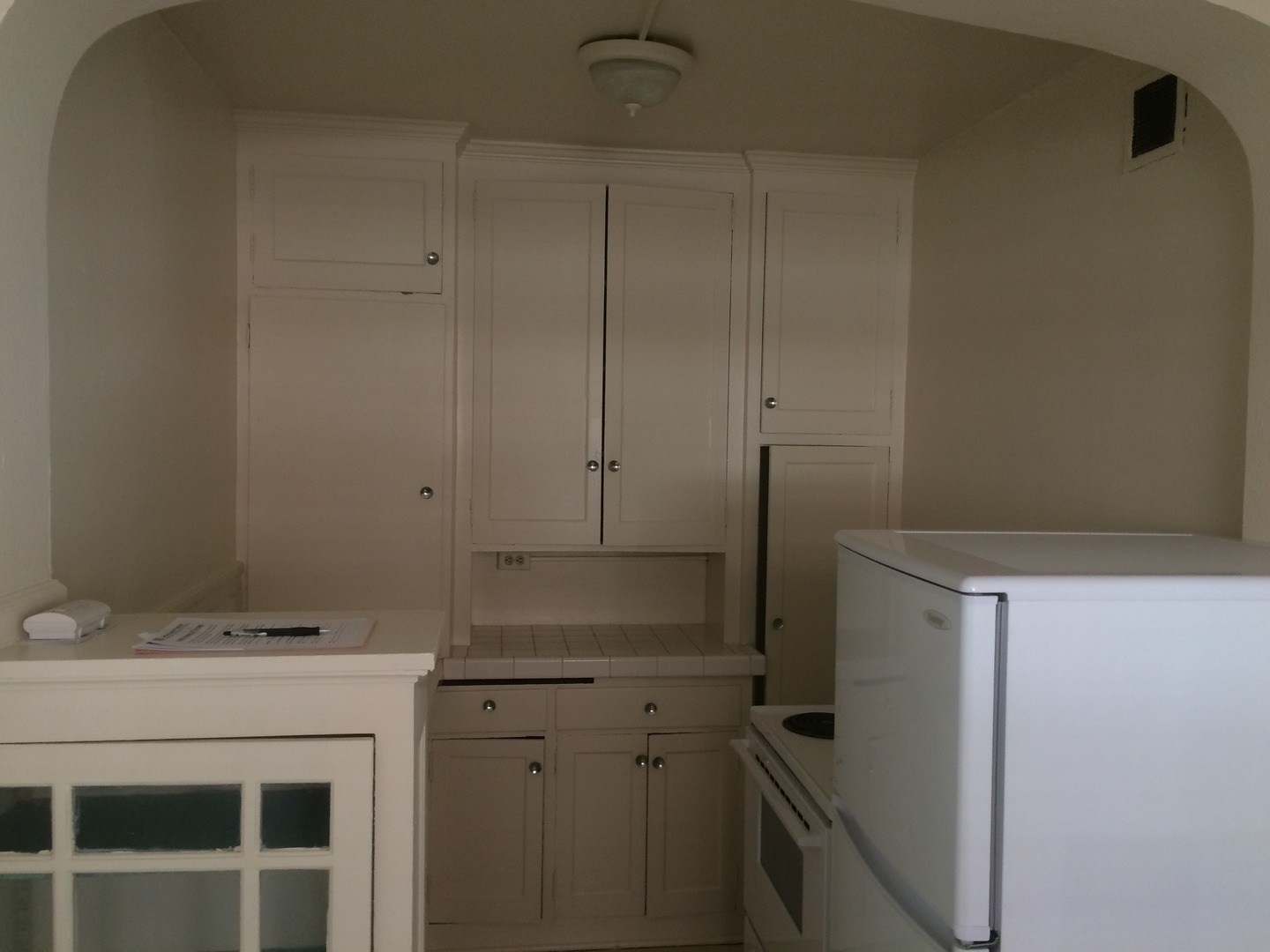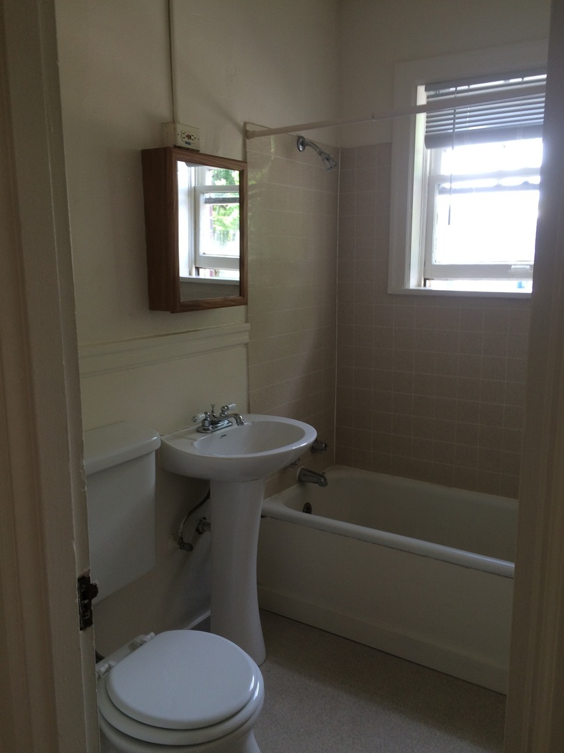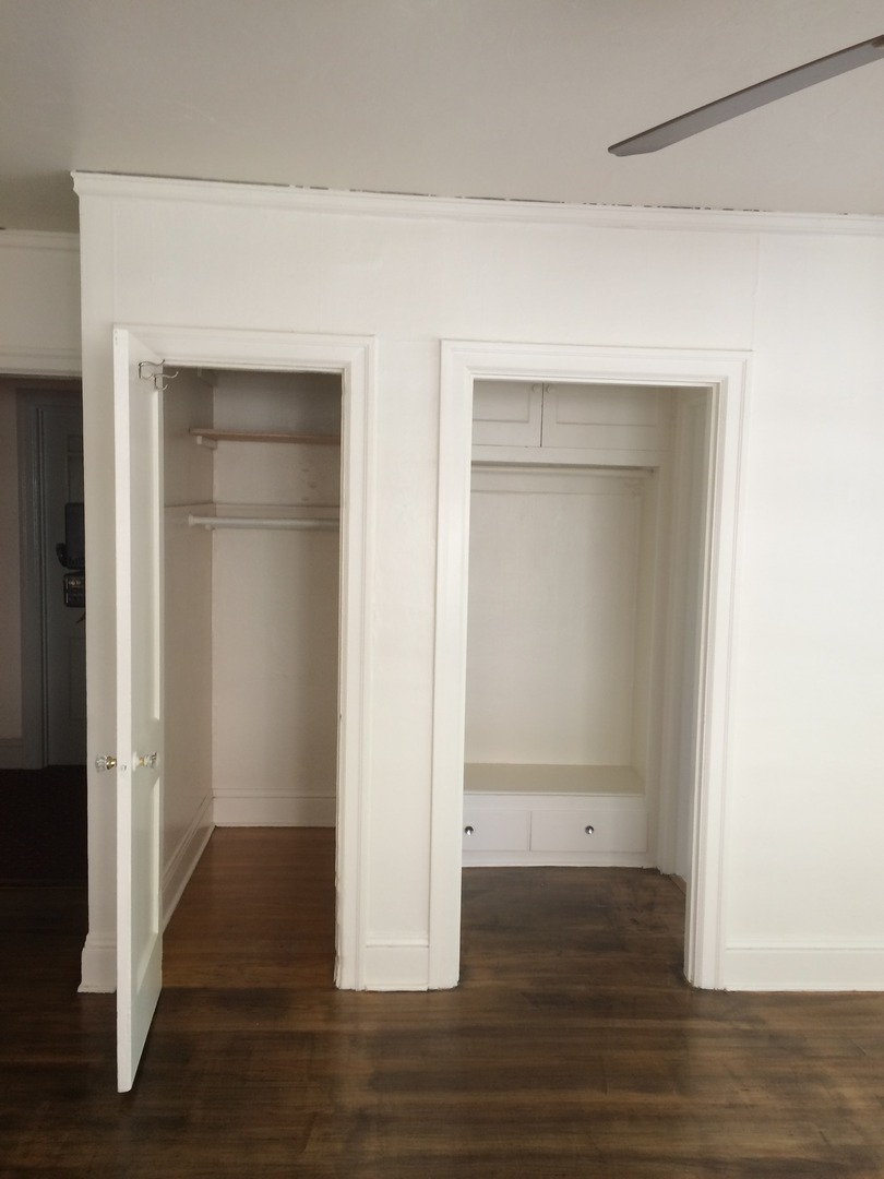 This spacious corner studio is filled with light and charm. It has two medicine cabinets, two closet spaces, original hardwood floors, original built-ins, and a cozy dining area.